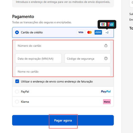 Ao optar por pagar com cartão de crédito, terá de introduzir o número do cartão, o nome impresso no cartão, a data de validade (MM/AA) e o código de segurança.
