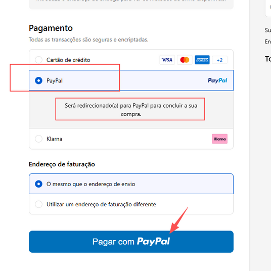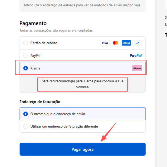 - Na finalização da compra, selecione "Pagar com Klarna".